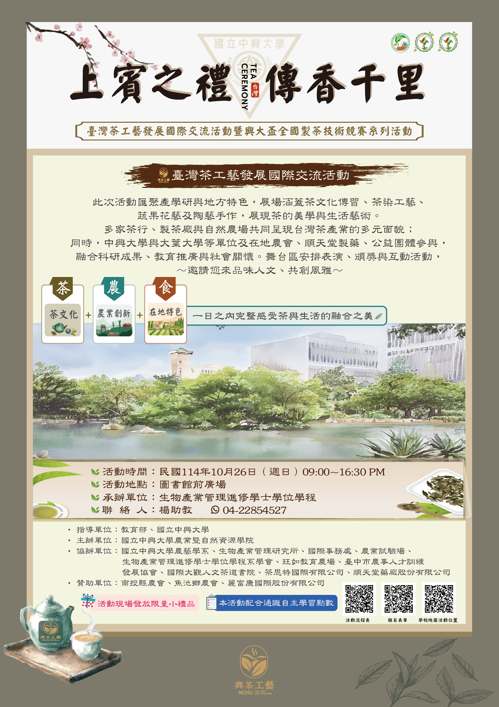 此次活動匯聚產學研與地方特色,展場涵蓋茶文化傳習、茶染工藝、蔬果花藝及陶藝手作,展現茶的美學與生活藝術。多家茶行、製茶廠與自然農場共同呈現台灣茶產業的多元面貌;同時,中興大學與大葉大學等單位及在地農會、順天堂製藥、公益團體參與,融合科研成果、教育推廣與社會關懷。