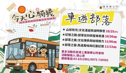 (一)為鼓勵民眾親近大自然及感受原鄉風情,花蓮縣萬榮鄉公所規劃騎乘電動輔助自行車及搭乘遊覽車方式,帶領民眾輕鬆體驗來自山林的呼喚與部落族人熱情的款待,以促進部落觀光發展。