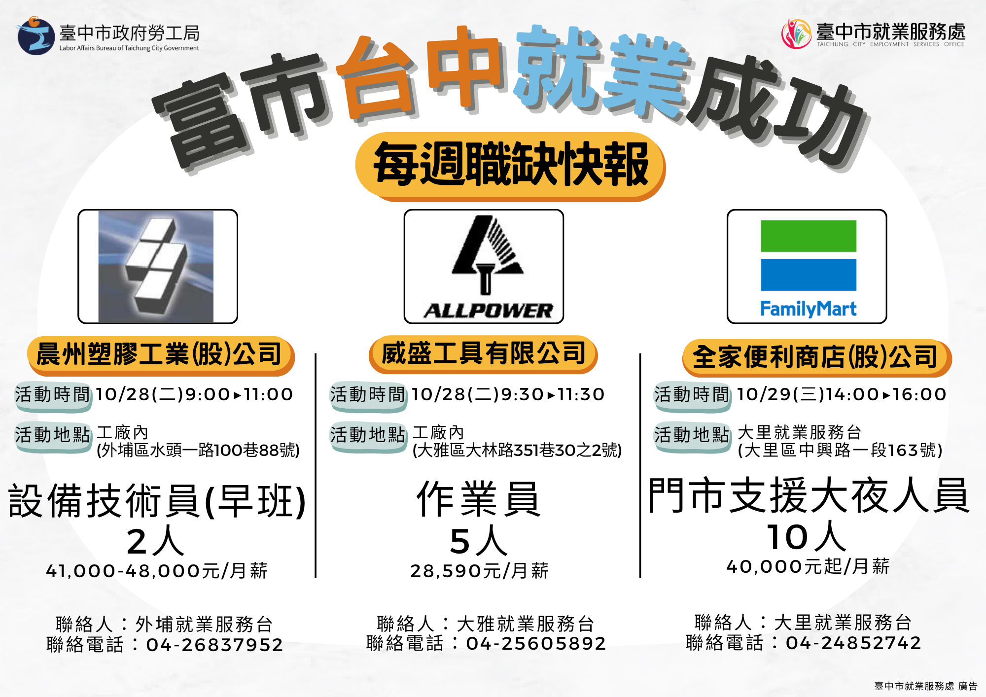 臺中市政府職缺快 報來囉!10/27-11/1邀請晨州塑膠、威盛工具、全家等廠商,辦理15場徵才,提供6,159個職缺,查詢更多職缺資訊:https://gov.tw/XJo,請洽04-22289111轉36100洽詢。