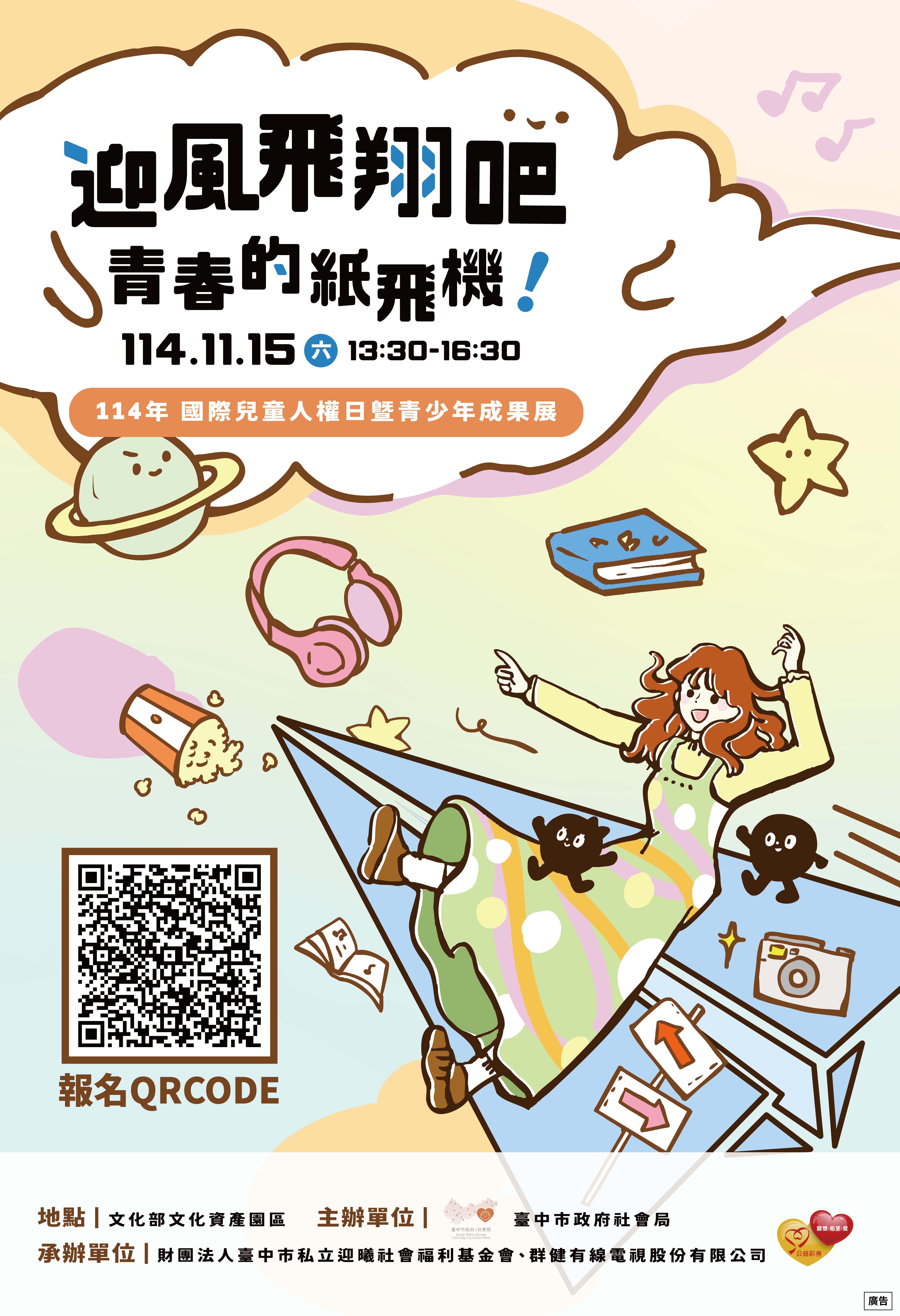 一、活動名稱:「迎風飛翔吧 青春的紙飛機!」114年國際兒童人權日暨青少年成果展