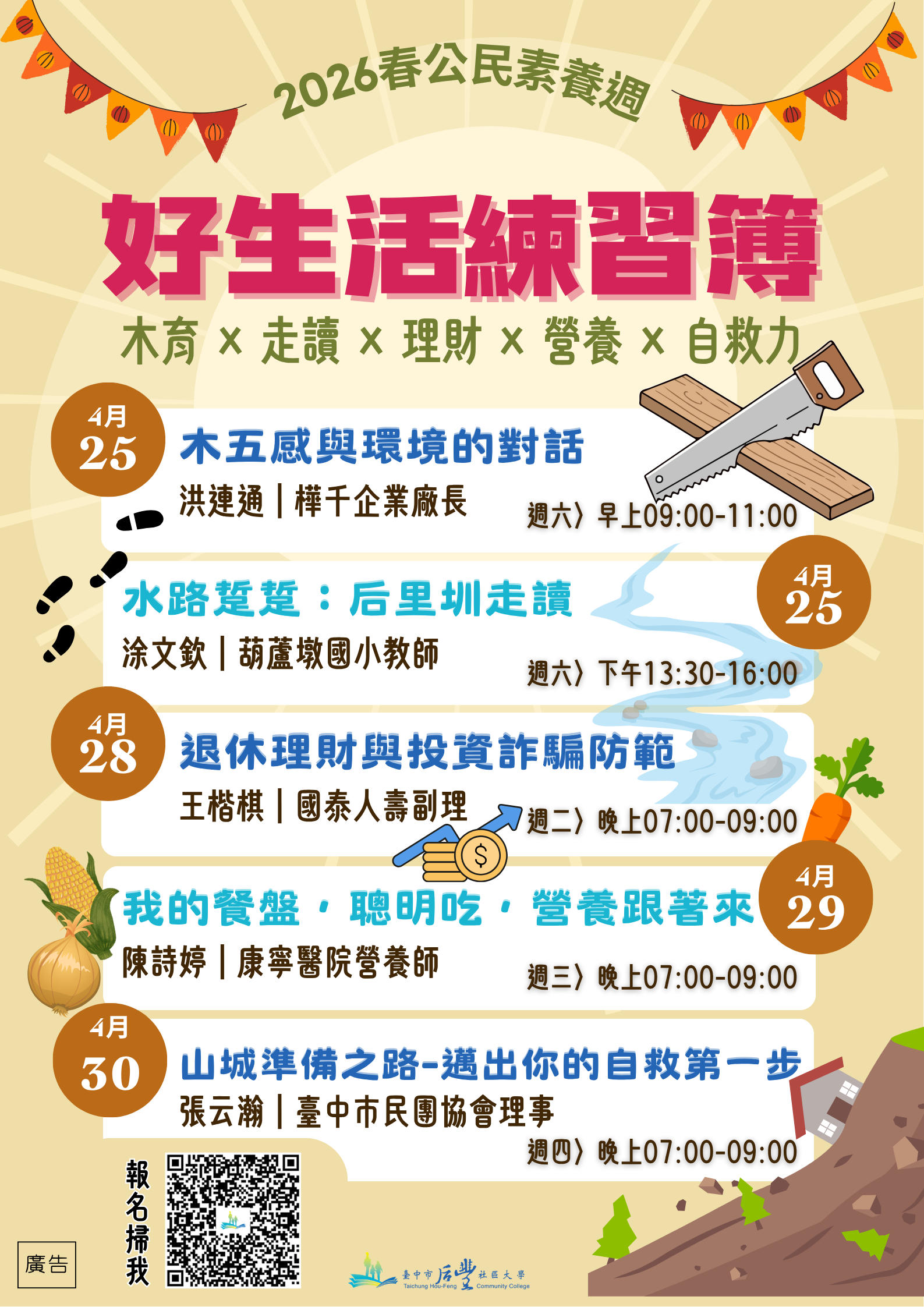 (二)場次皆免費參與,詳細內容請參閱后豐社區大學公民素養週報名頁面(https://forms.gle/A39mL5omQUEWjNM1A)或電洽承辦人。三、講座活動可申請公務人員終身學習時數、教師研習時數、一般研習時數。